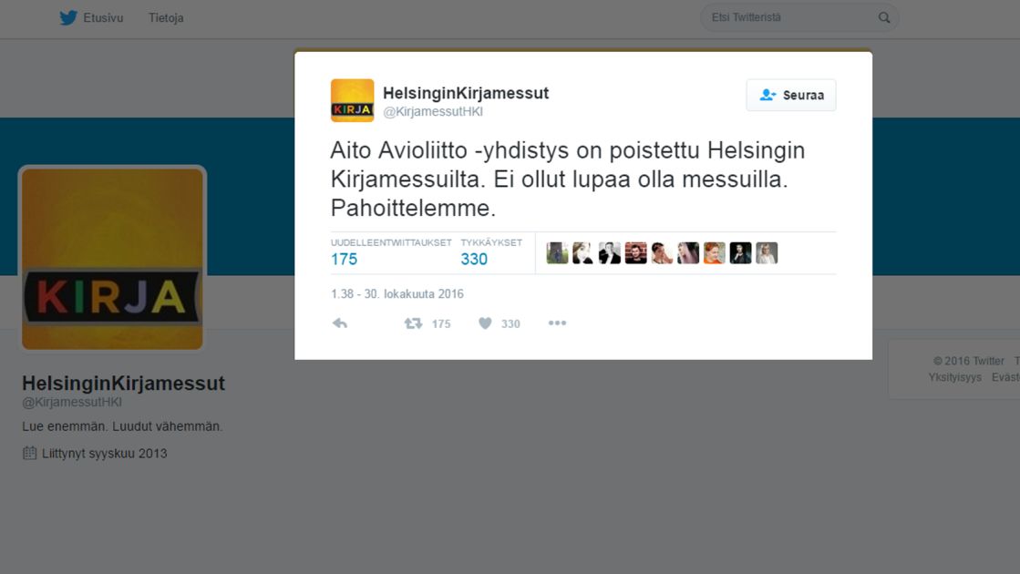 Periaatteessa tuo messuilta poisto on voinut olla ihan asiallinen toimi. Omassa twiitissään Aito avioliitto ry ilmoitti, että moka oli heidän. Ja joku oheispaheksuja jo huomautti toisaalla, että jokin AA:n lippu jäi vielä osastolle… Eli ainakaan täyttä sensuuria ei tullut. Mutta minusta on erittäin kummallista, että messuorganisaatio katsoi tarpeelliseksi pahoitella julkisesti tapahtunutta. Kuten uutisessakin mainittiin, mitään virallista kieltoa AA:n mukana ololle ei ole. Miksi asiaa siis pitäisi pahoitella yleisölle? Ei kai VR pyydä muilta matkustajilta anteeksi, jos konduktööri havaitsee jonkun matkustavan ilman lippua?